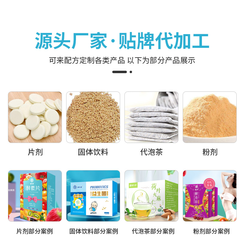 固體飲料、 粉劑、 片劑、代用茶、 袋泡茶、 壓片糖果、 代餐粉/奶昔、膠原蛋白肽、膳食纖維等