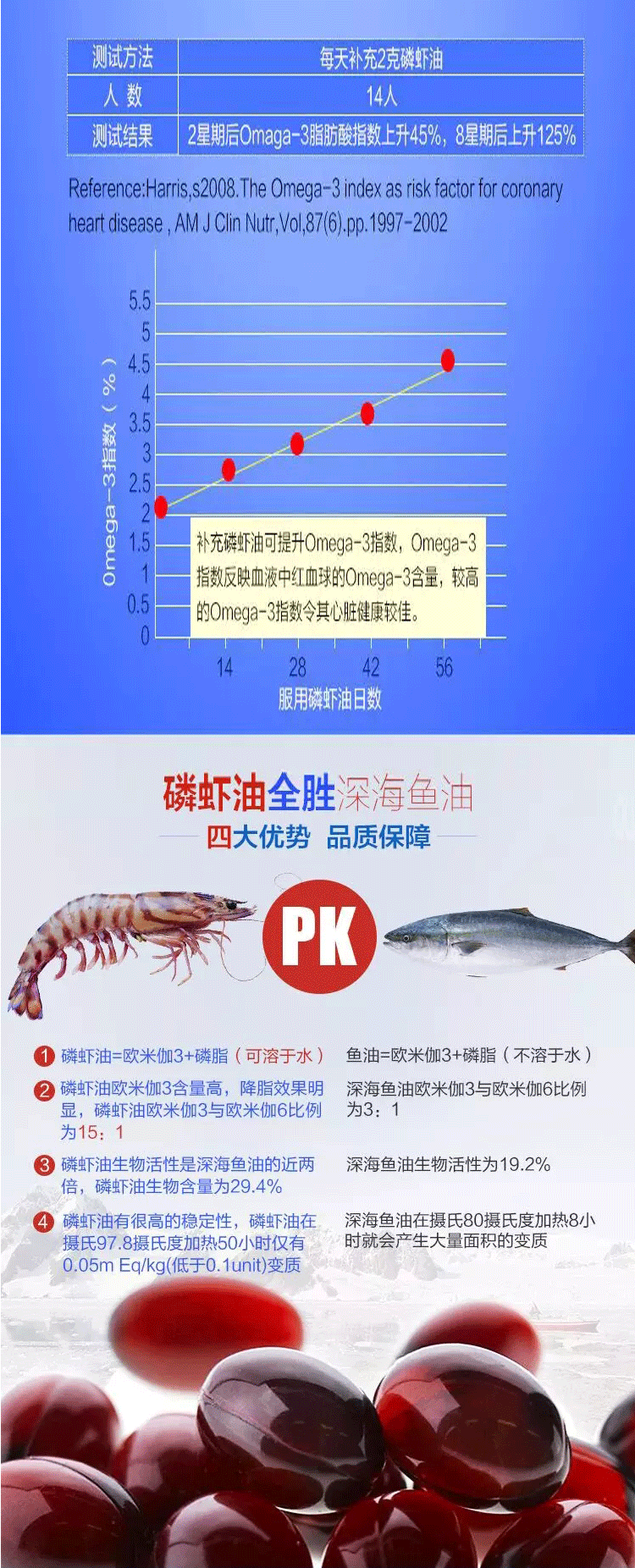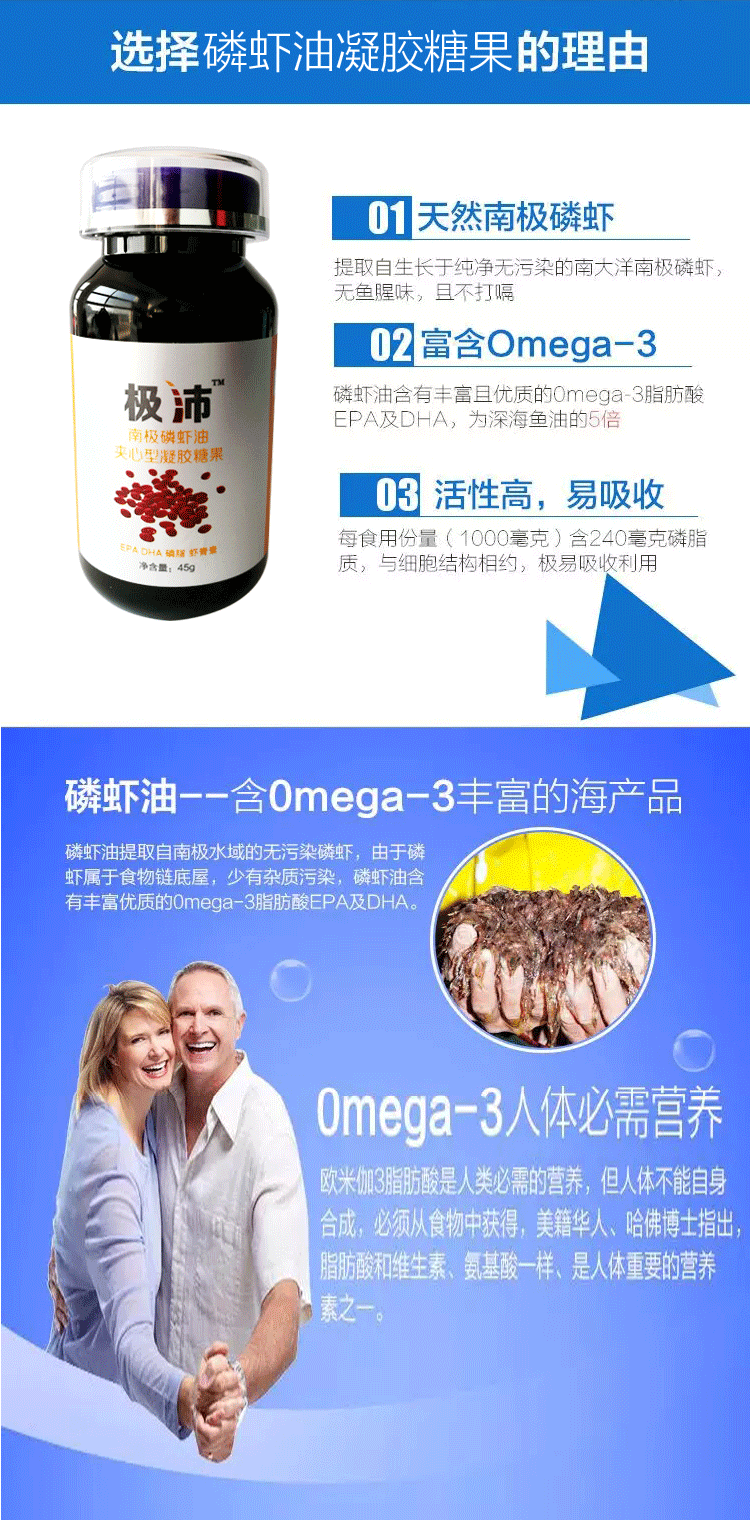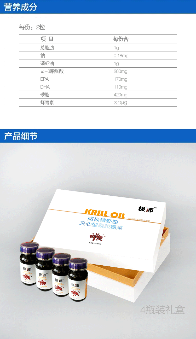 南極磷蝦油含有豐富的歐米伽3(EHA/DPA),磷脂、蝦青素。是魚油的升級產(chǎn)品。